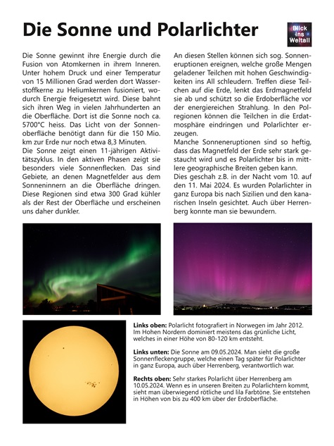 Bei starken Polarlichtern in unseren Breiten dominieren die violetten Anteile des Polarlichts in großen Höhen von bis zu 400 km. Die Zeitraffersequenzen in der Bilderschau auf dem Monitor im 1. OG zeigen die schnellen Veränderungen.