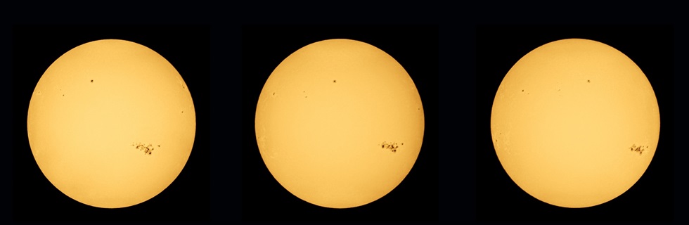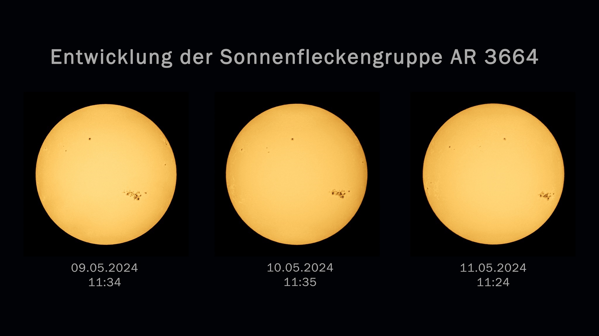 Zeitliche Entwicklung der großen Sonnenfleckengruppe, welche für die Polarlichter am 10. Mai 2024 verantwortlich war. Aufgrund der Rotation der Sonne wandert sie täglich ein Stück nach Westen, verändert sich dabei aber auch.