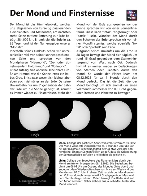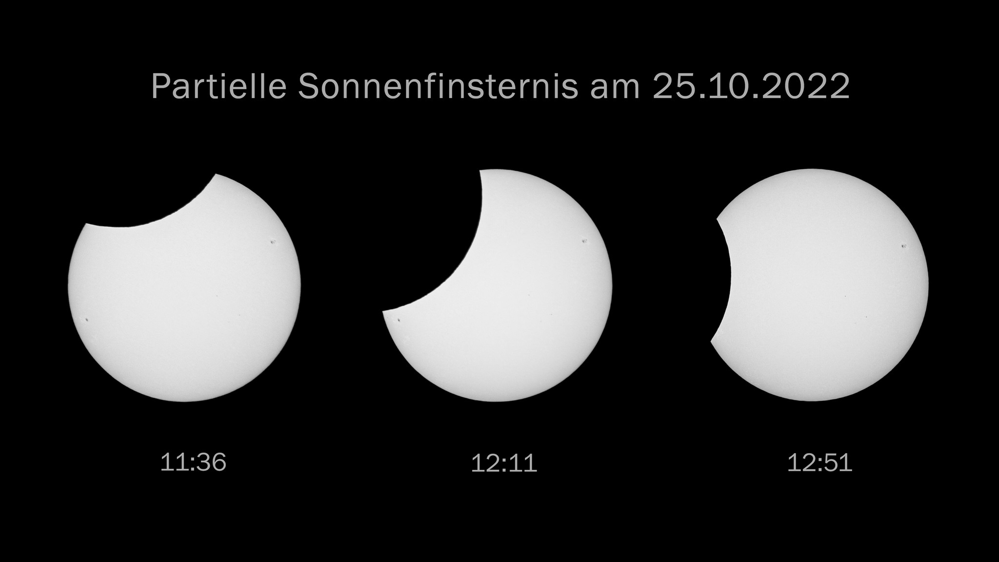 Im Oktober 2022 konnte man von Herrenberg aus eine partielle Sonnenfinsternis beobachten. Dabei wanderte der Mond innerhalb von ca. 2 Stunden vor der Sonne vorbei. Bei uns betrug der maximale Bedeckungsgrad etwa 23%.