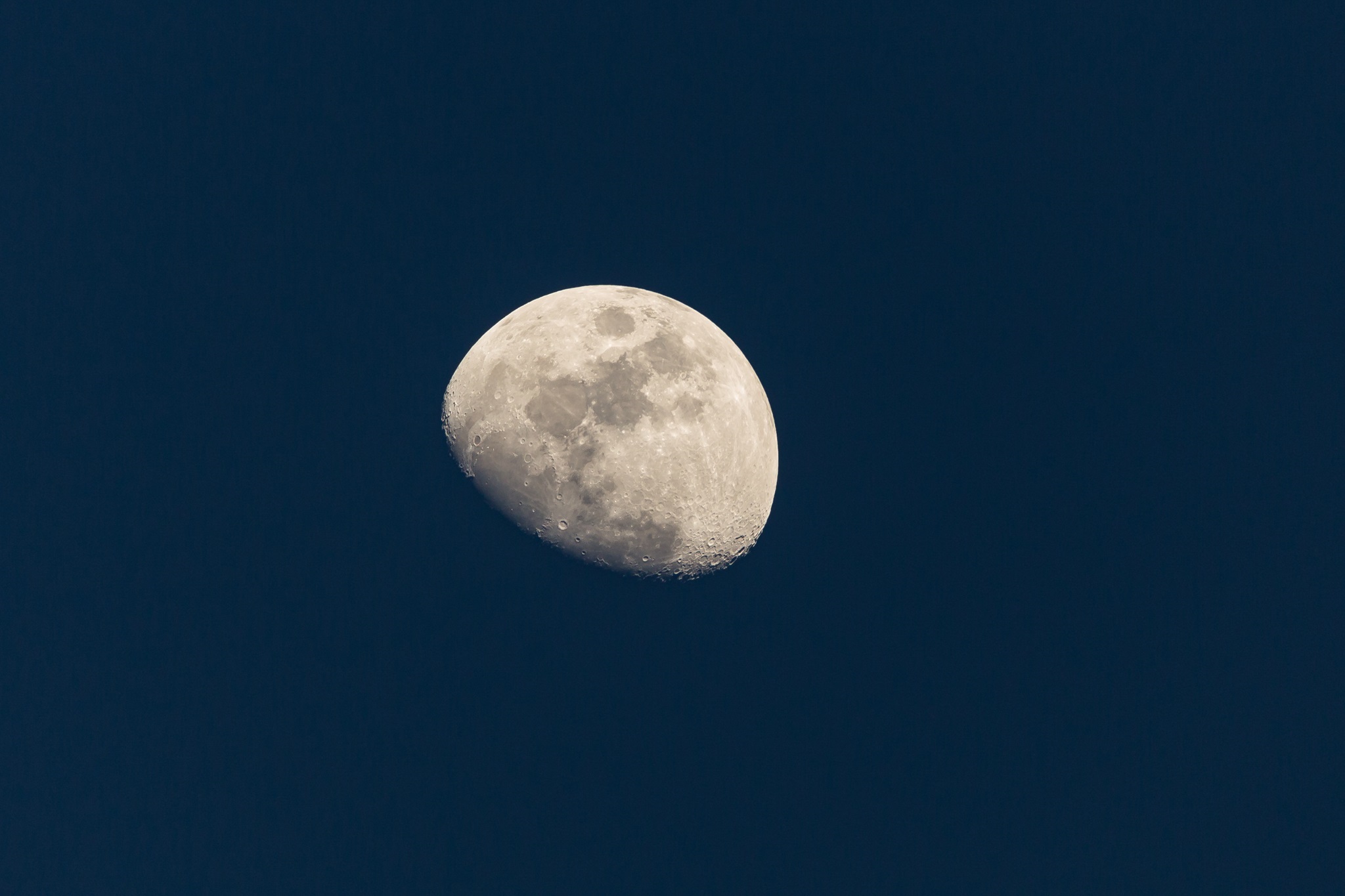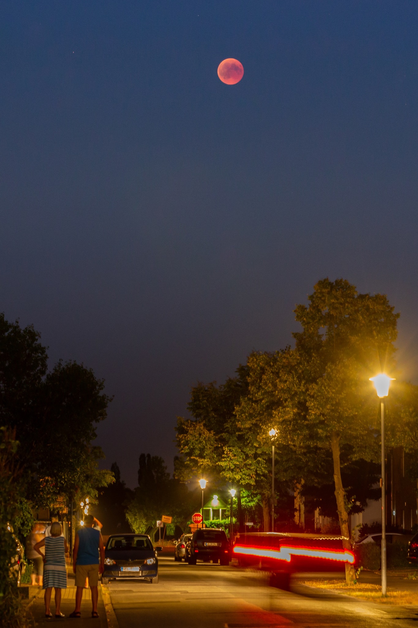Mondaufgang in der blauen Stunde. Der Mond war zu 88% beleuchtet. Dadurch und aufgrund der langen Belichtungszeit von 30 Sekunden und der Verzerrung durch das Weitwinkel-objektiv wirkt er nicht mehr rund.