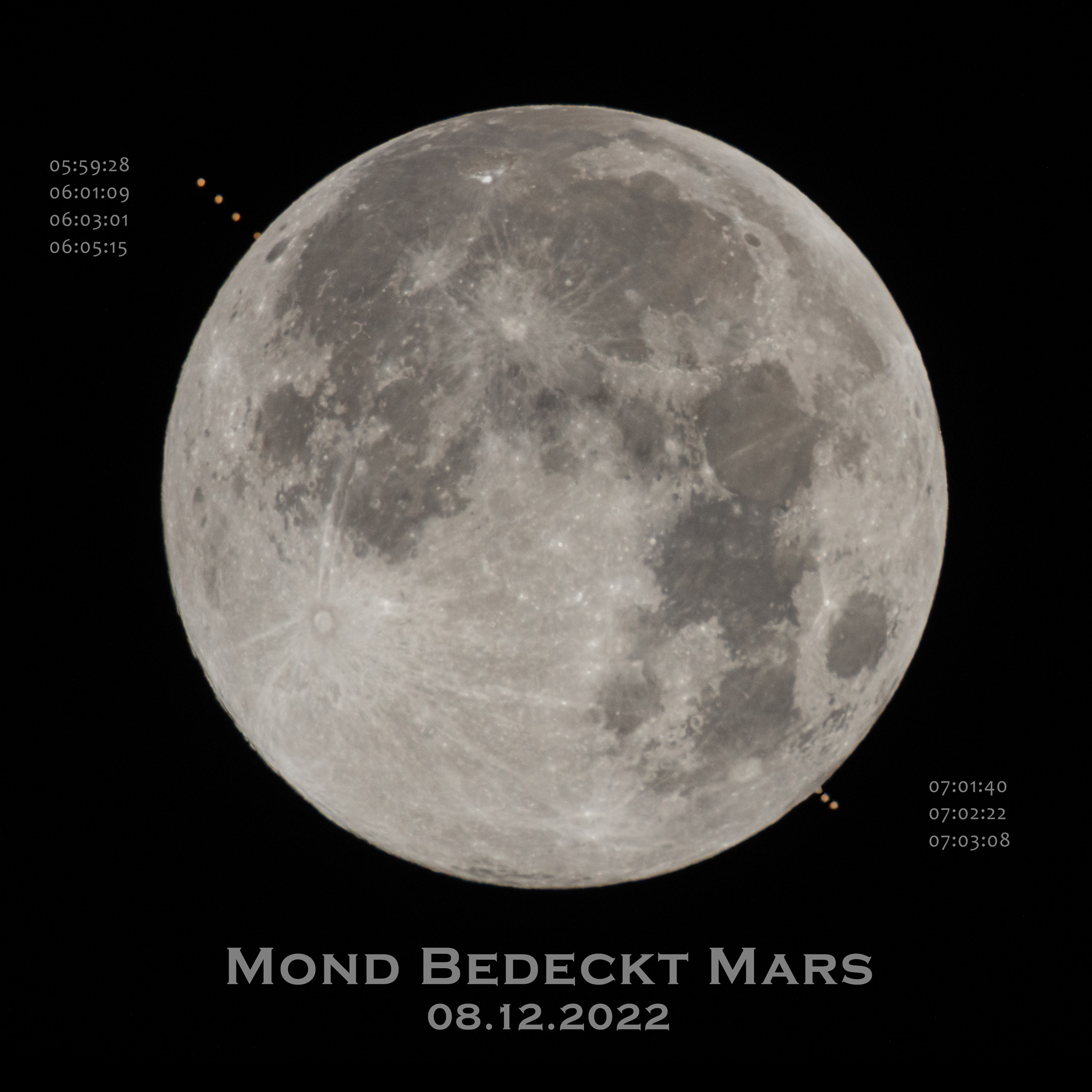 Der Mond bleibt gegenüber den Sternen und Planeten um ca. einen Vollmonddurchmesser pro Stunde in Richtung Osten zurück. Daher wandert er scheinbar von West nach Ost über Mars hinweg.