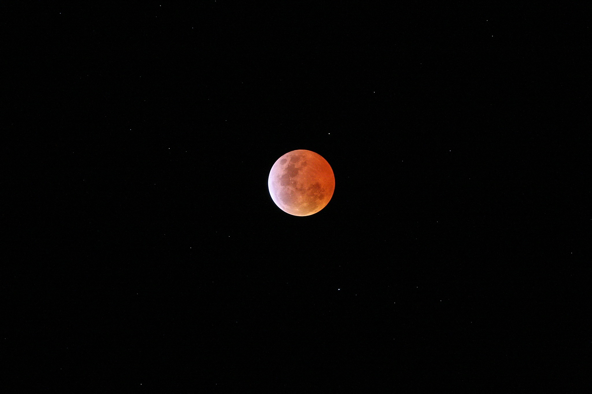 Bei einer totalen Mondfinsternis wird der Mond nicht komplett dunkel. Die Erdatmosphäre streut Sonnenlicht in den Schattenbereich und daher erhält der Mond immer noch etwas Licht, insbesondere in den langen (roten) Wellenlängen.