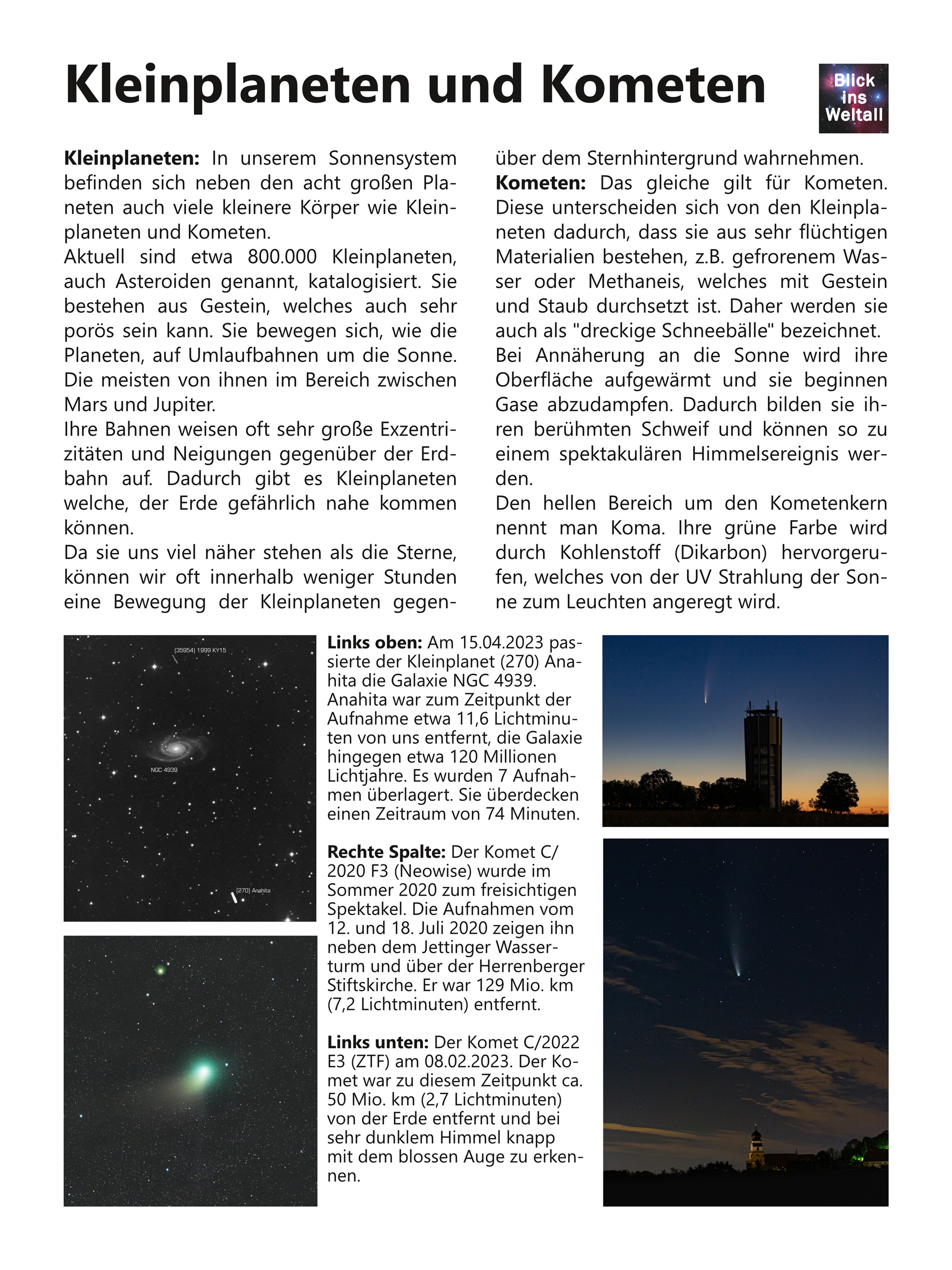 Im Sommer 2020 war der Komet C/2020 F3 (Neowise) für längere Zeit mit bloßem Auge zu sehen. Er war der hellste Komet auf der Nordhalbkugel seit 2007. Im Video können Sie mehrere Zeitraffer dieses Kometen sehen.