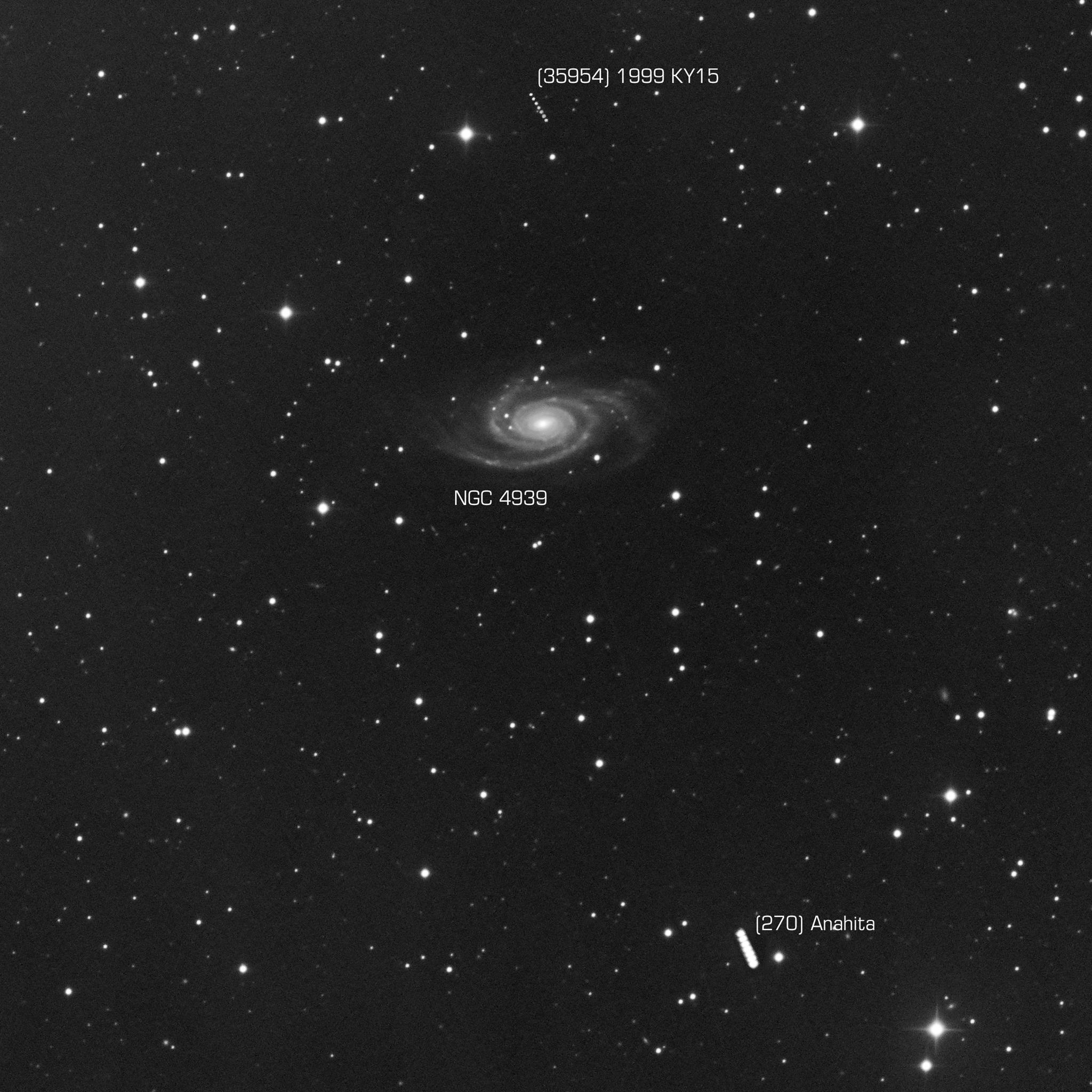 Begegnung zwischen den Kleinplaneten (270) Anahita und (35954) 1999 KY15 und der Spiralgalaxie NGC 4939. Die Collage zeigt die Bewegung der Kleinplaneten relativ zur Galaxie im Laufe von einer Stunde.