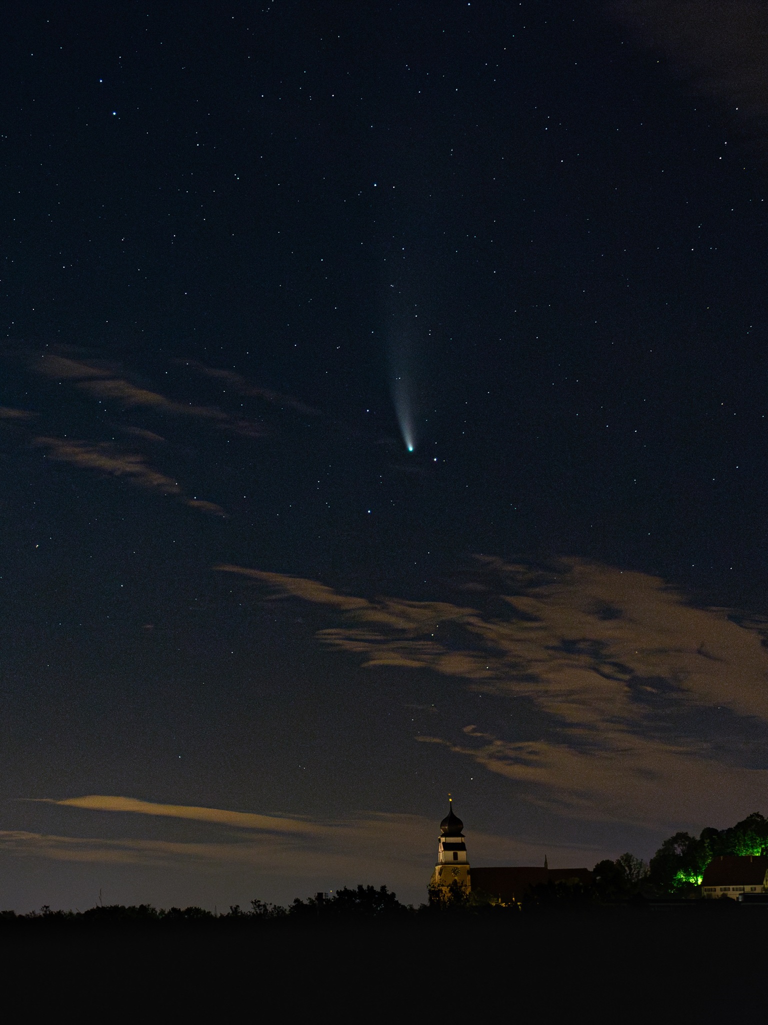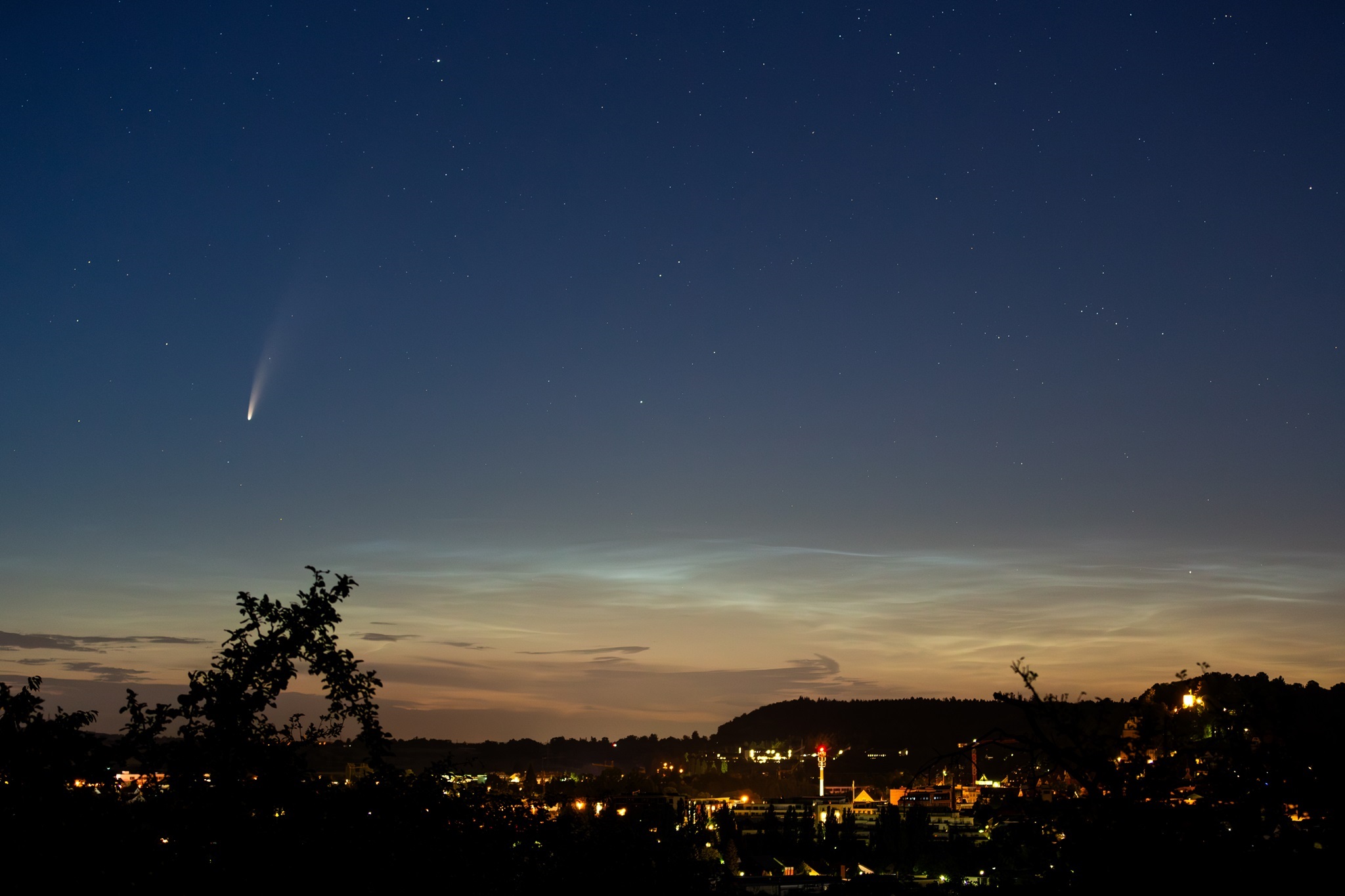 Im Sommer 2020 war der Komet C/2020 F3 (Neowise) für längere Zeit mit bloßem Auge zu sehen. Hier stand er gleichzeitig mit silbrig glänzenden Nachtleuchtenden Wolken (NLC, „Noctilucent clouds“) am frühen Morgen über Herrenberg.