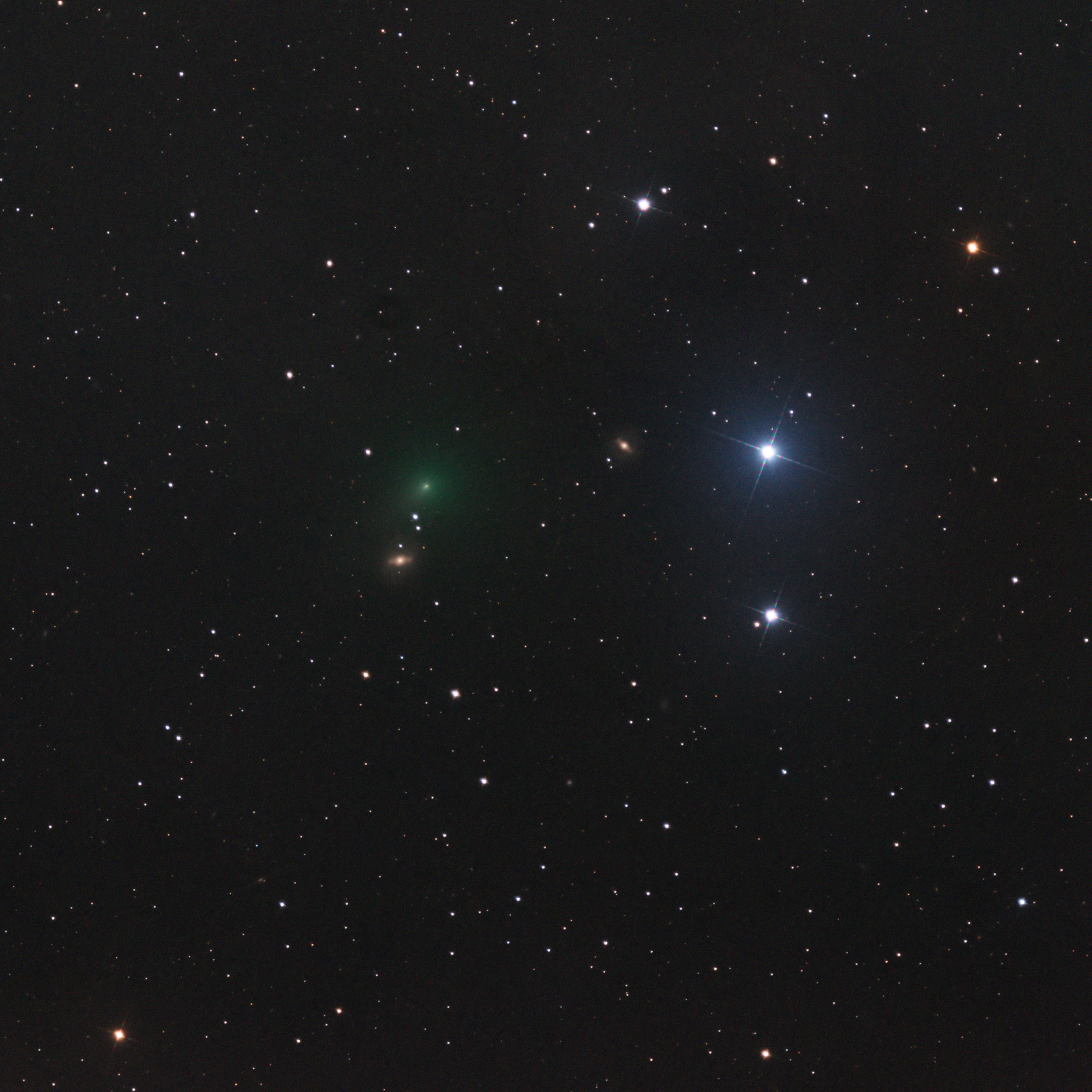 Dieser periodische Komet umkreist die Sonne alle 6,6 Jahre. Hier sehen wir ihn bei seiner Annäherung an Sonne und Erde im Februar 2024. Zufällig steht er nahe bei zwei weit entfernten Galaxien im Hintergrund.