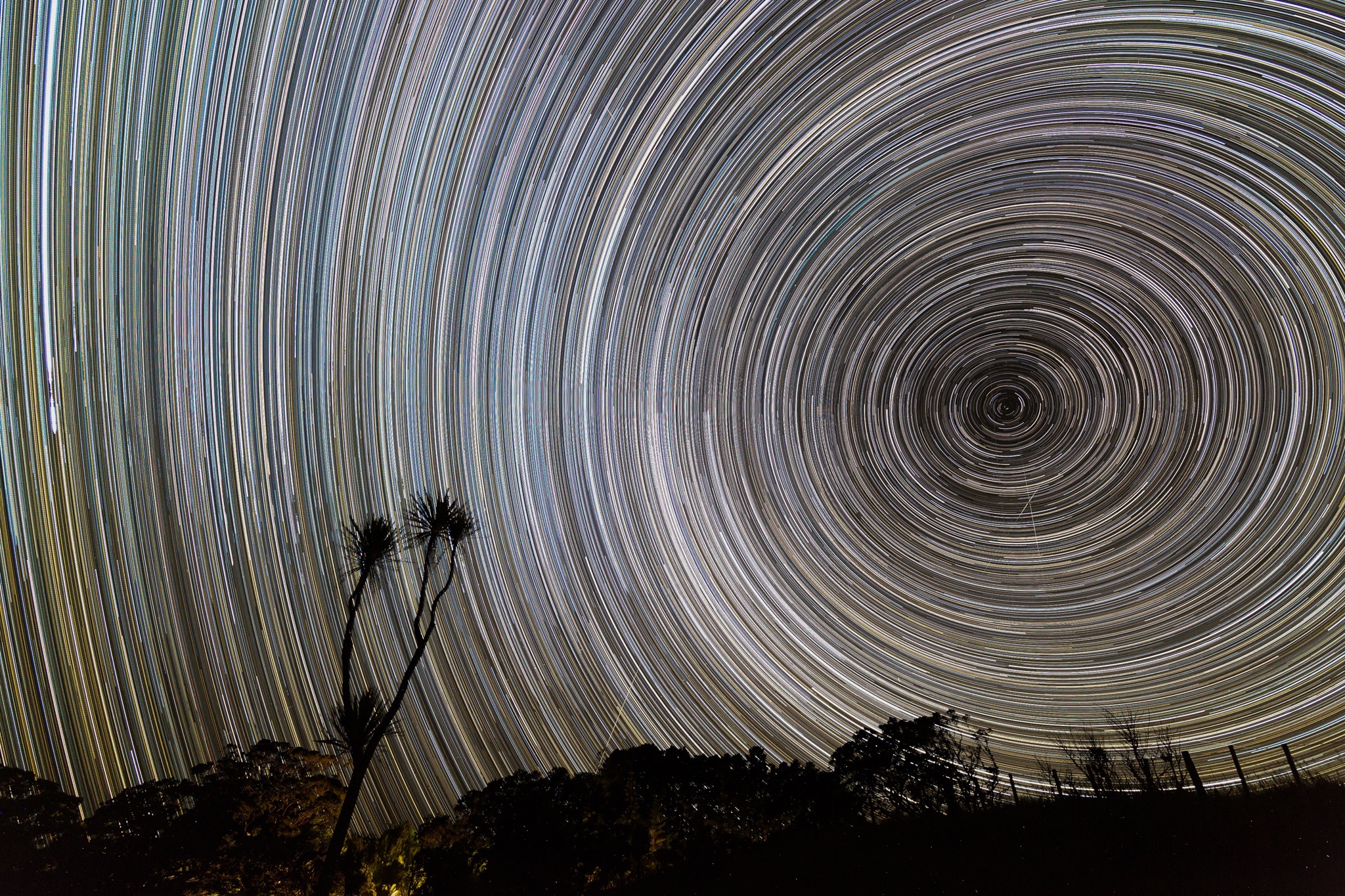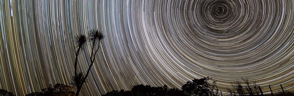 Komposit aus 440 Aufnahmen über einen Zeitraum von 4 Stunden des südlichen Sternhimmels. Da es in der Nähe des südlichen Himmelspols keine besonders hellen Sterne gibt, hat man den Eindruck eines Tunnels.