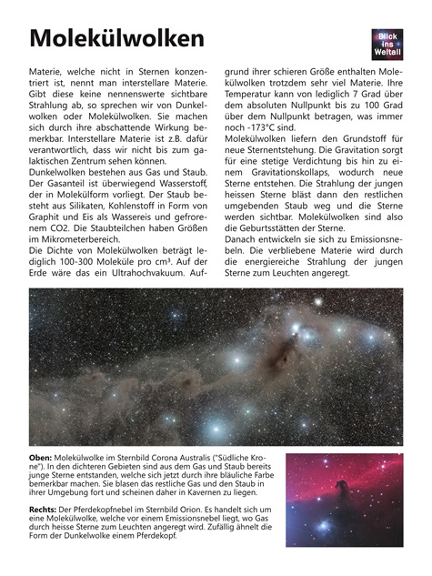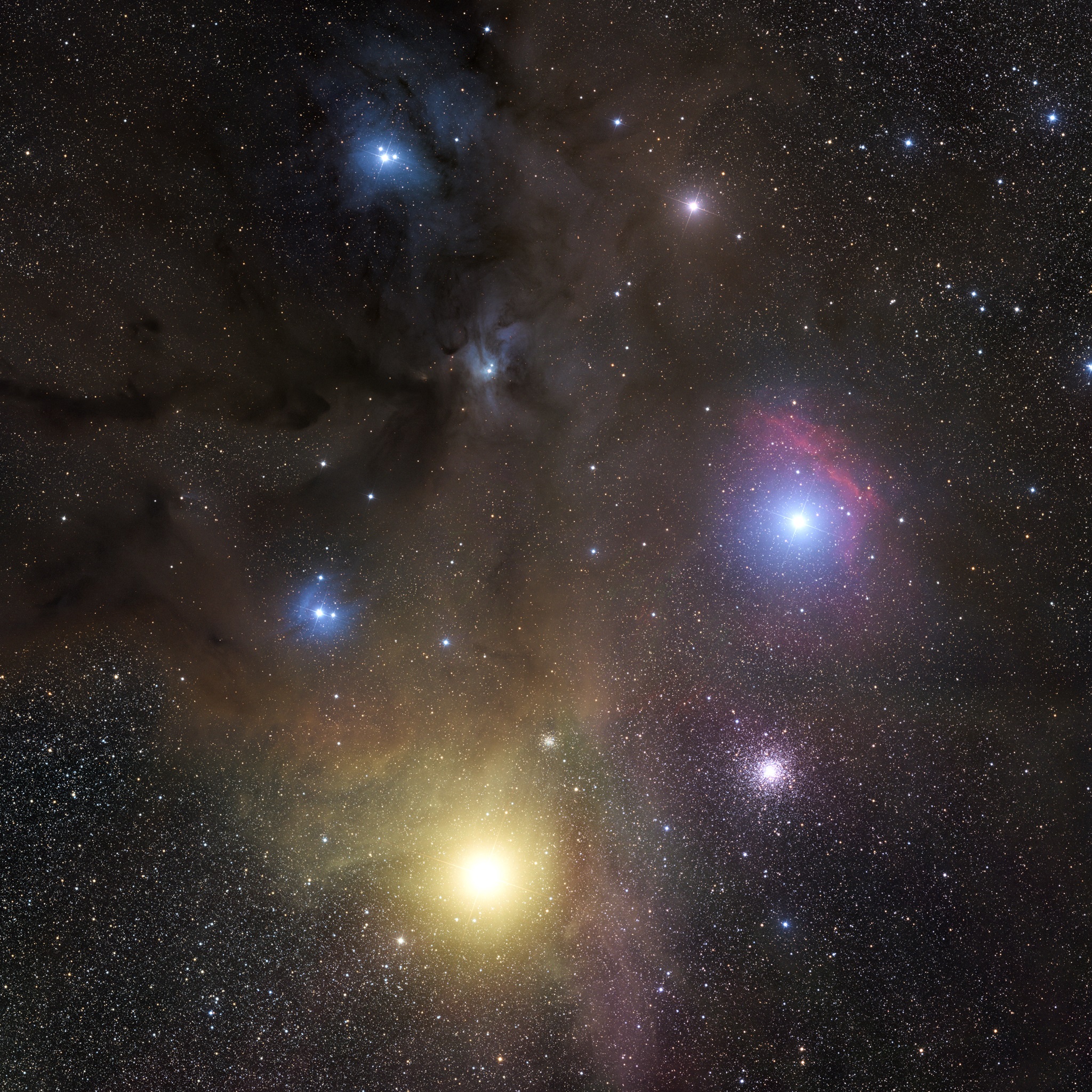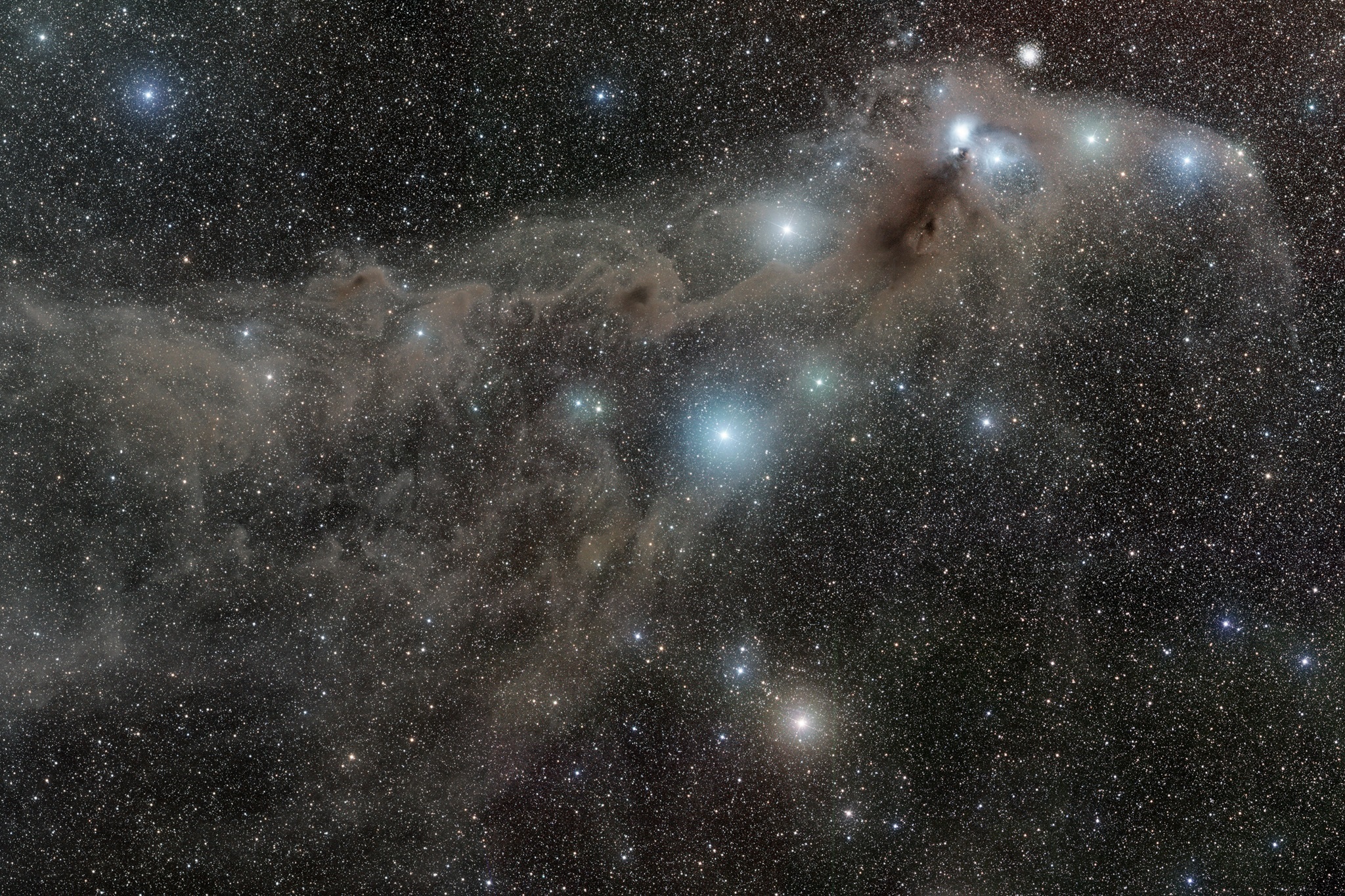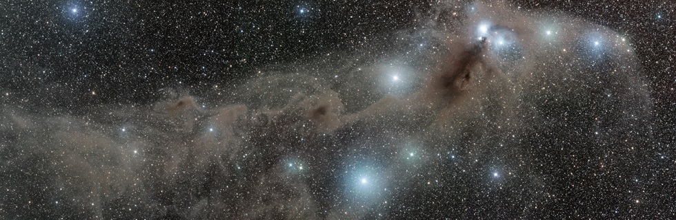 Diese Molekülwolke ist nur 420 Lichtjahre von uns entfernt und damit eines der uns am nächsten gelegen Sternentstehungsgebiete. Wir sehen ausgeprägte Staubwolken und junge blaue Sterne an den dichten Knoten.