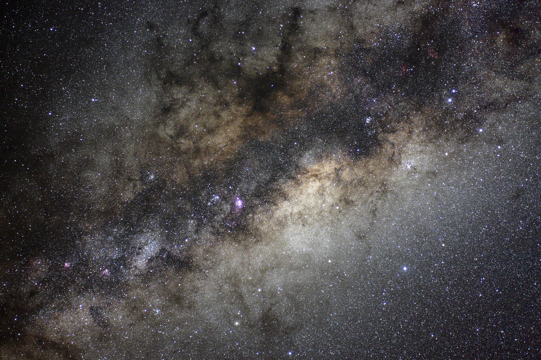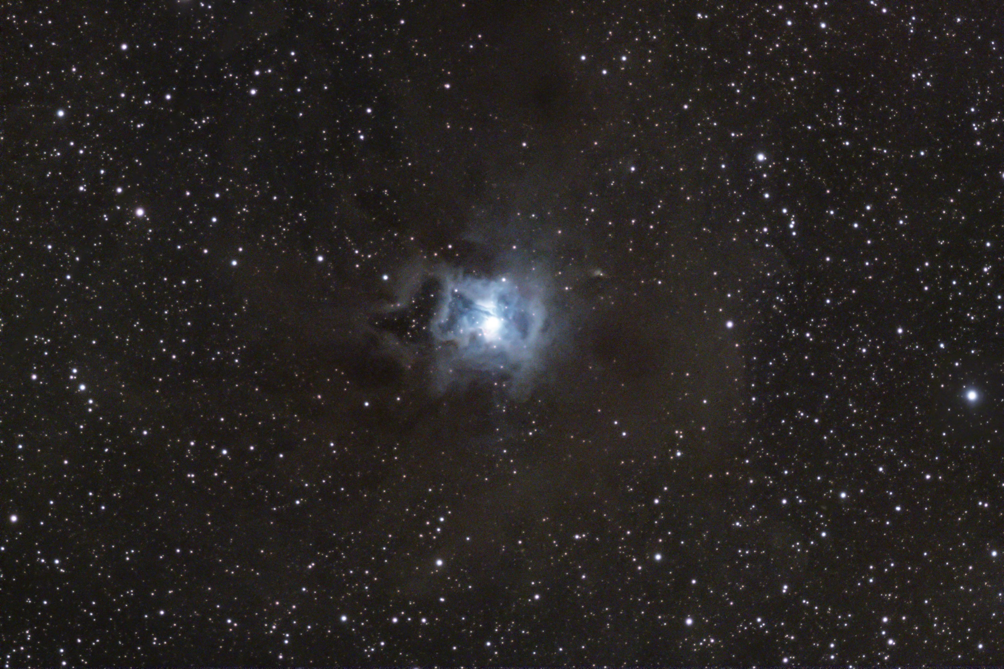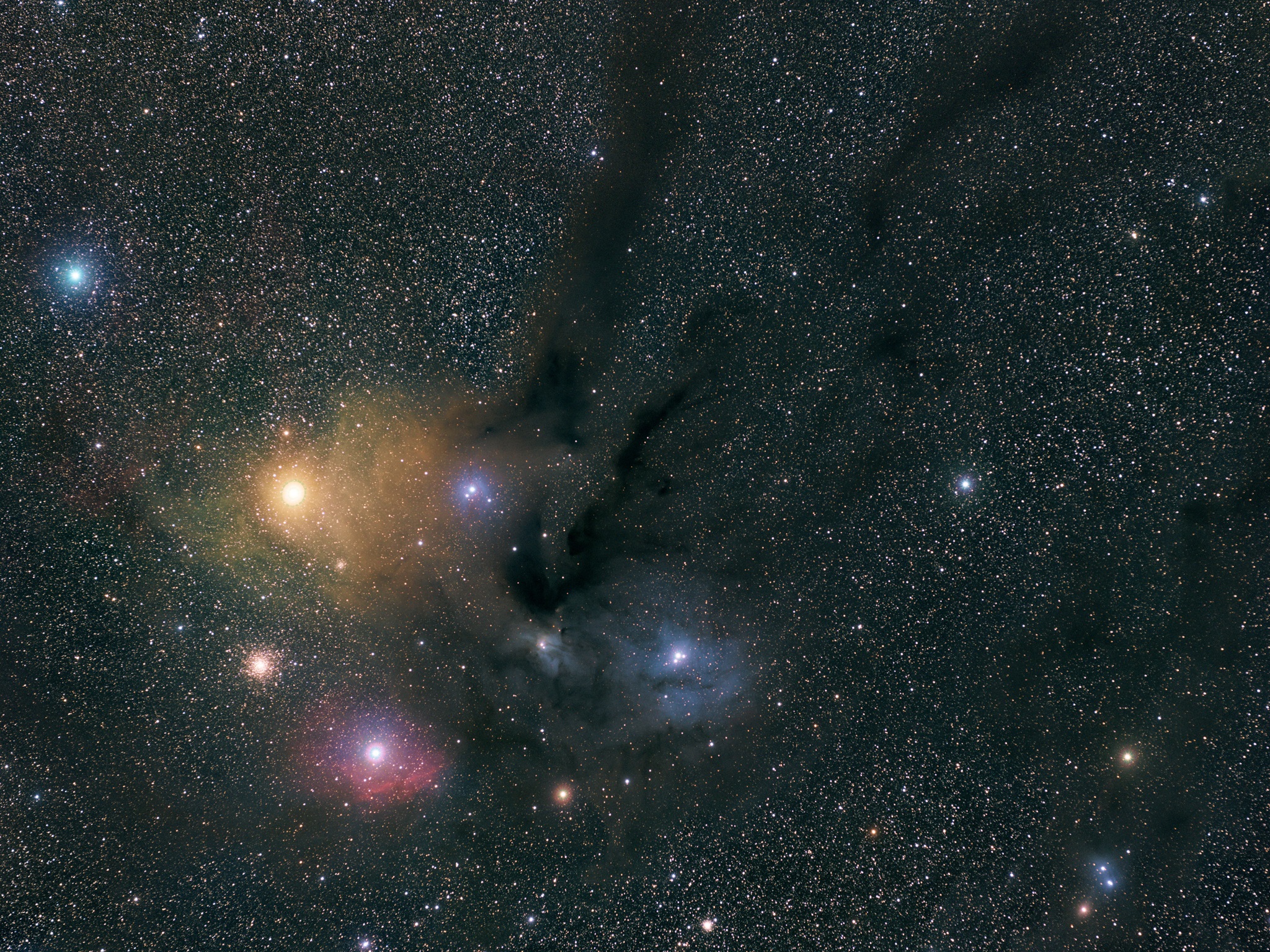 Diese Molekülwolke ist nur 420 Lichtjahre von uns entfernt und damit eines der uns am nächsten gelegen Sternentstehungsgebiete. Wir sehen ausgeprägte Staubwolken und junge blaue Sterne an den dichten Knoten.