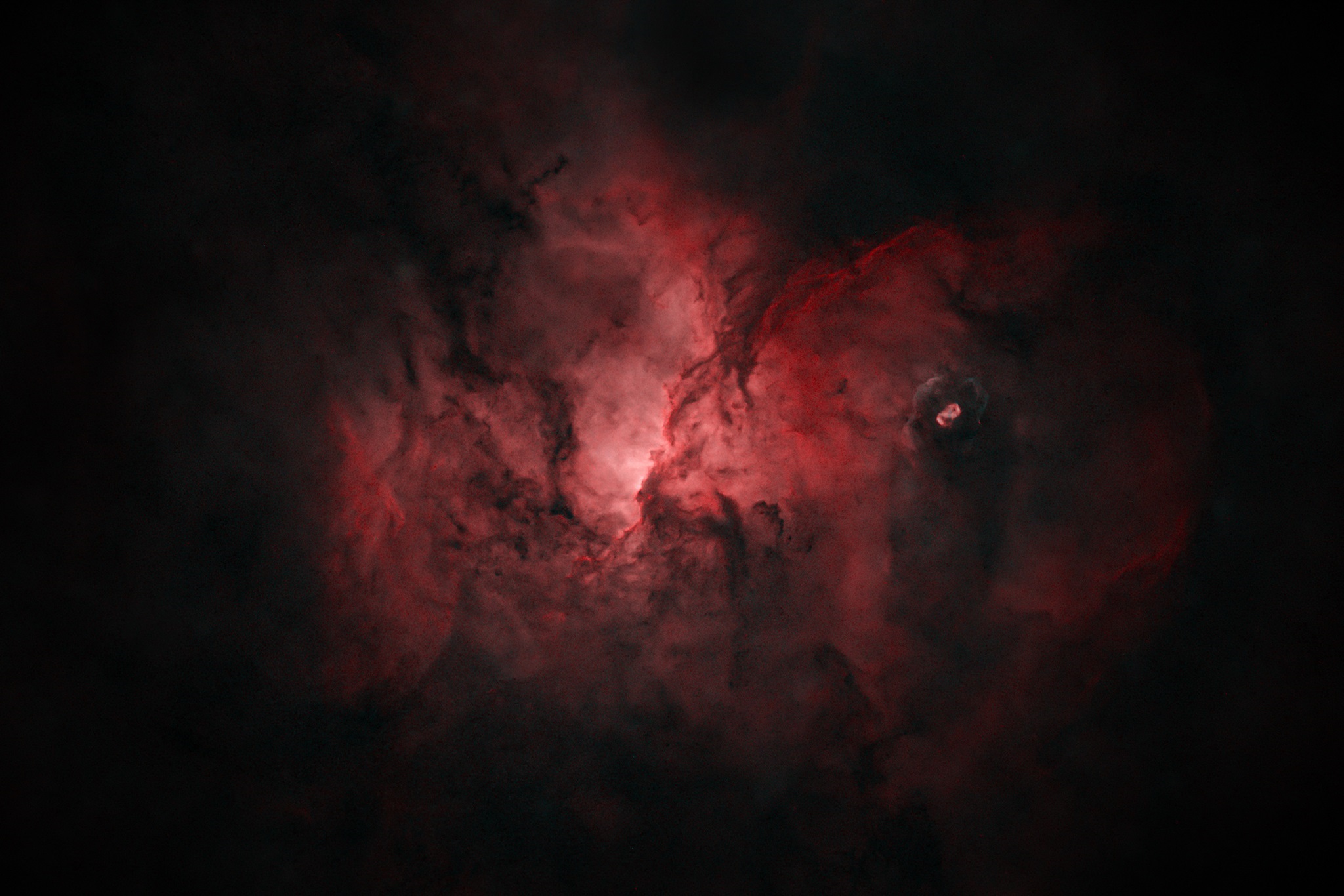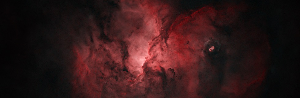 Dieser Emissionsnebel im Sternbild Altar am Südhimmel ist etwa 4.700 Lichtjahre entfernt. Er liegt in einer Region hoher Sterndichte. Um die Strukturen des Nebels besser sichtbar zu machen, wurden die Sterne aus dem Bild herausgerechnet.