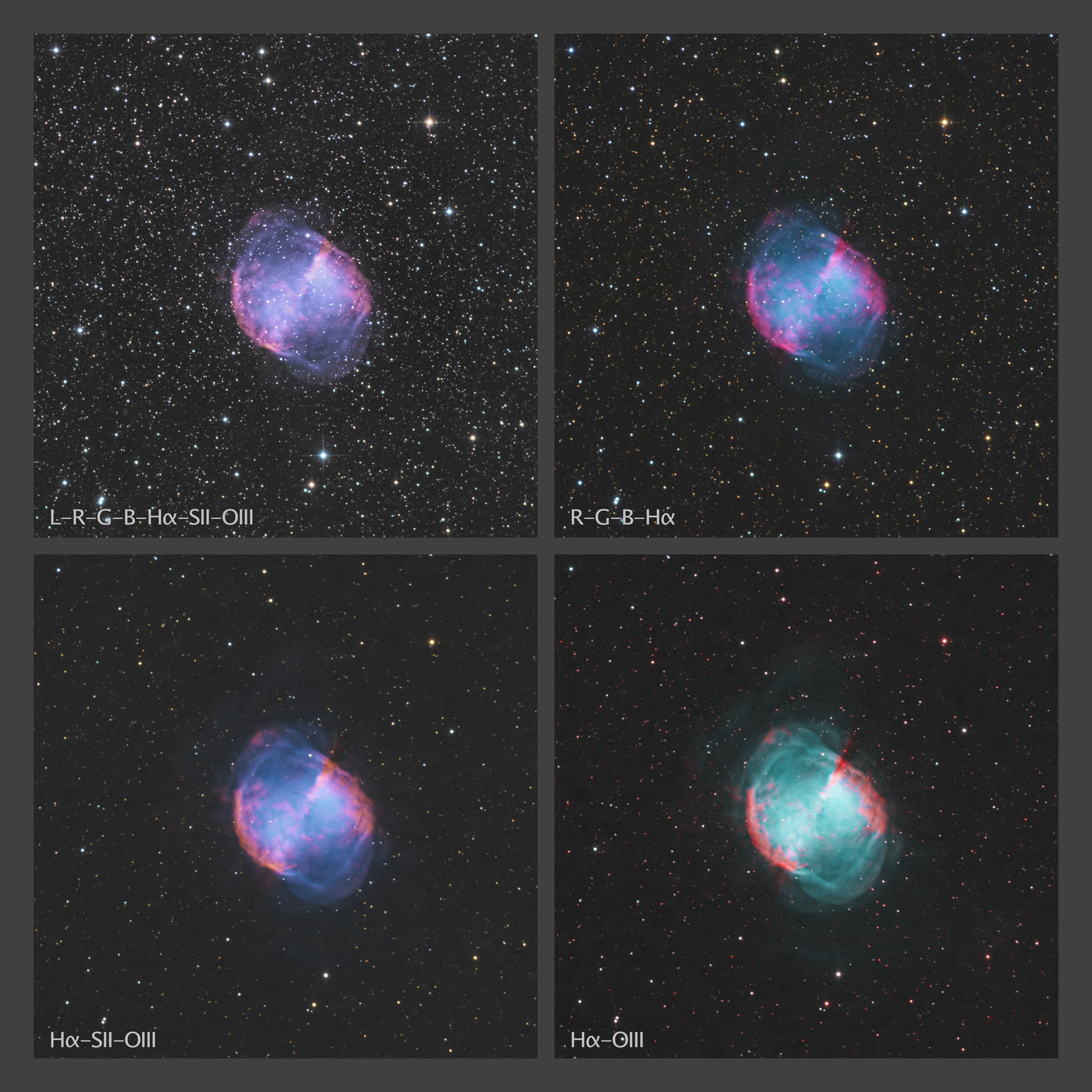 Der Hantelnebel, ein Planetarischer Nebel im Sternbild Fuchs dargestellt in vier Varianten mit verschiedenen Kombinationen der astronomischen Farbfilter. Im Licht der Schmalbandfilter treten die Sterne gegenüber dem Nebel zurück.