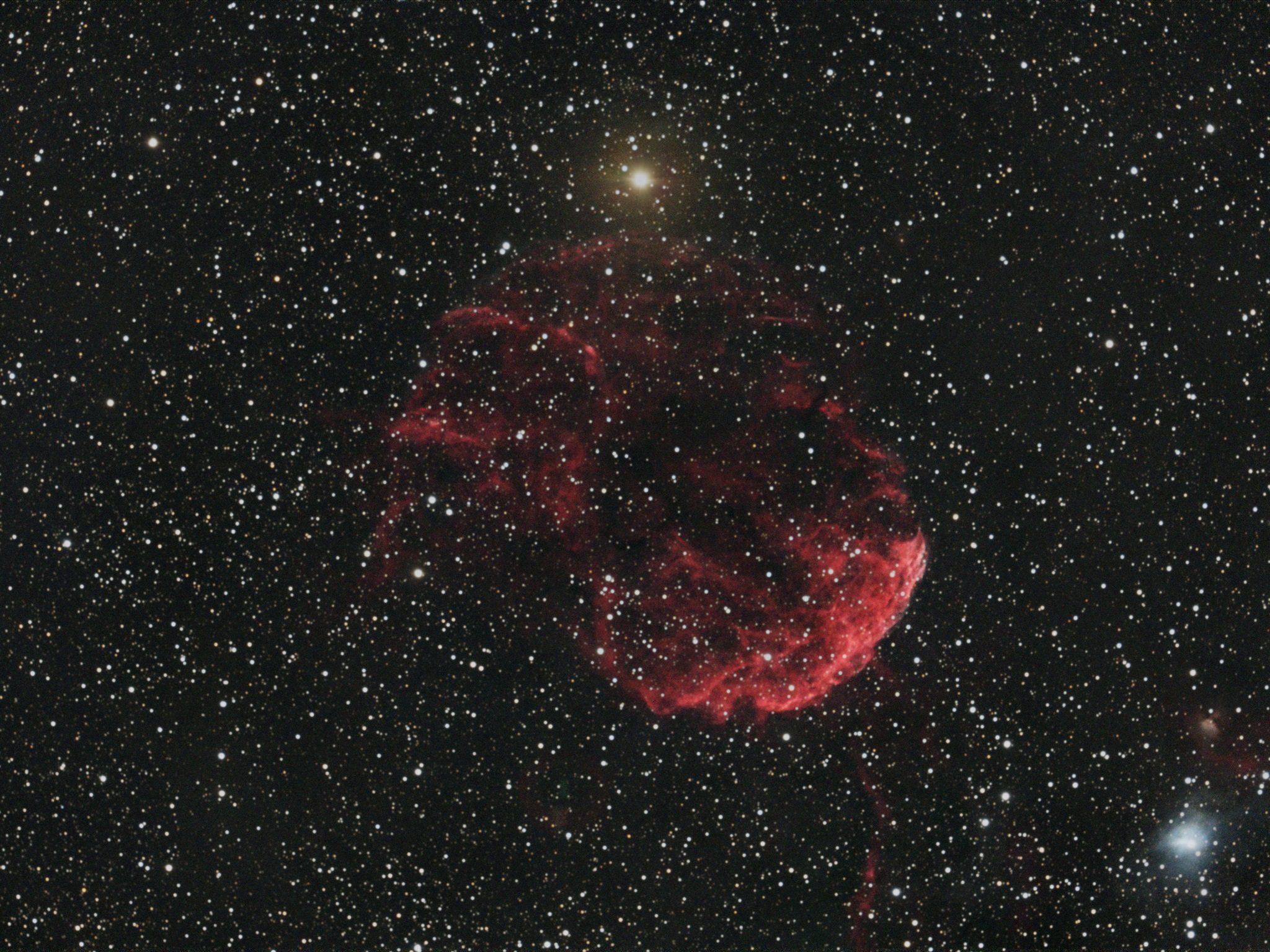 Dieser Supernova-Überrest im Sternbild Schwan ist 2.500 Lichtjahre entfernt. Er ist das Resultat einer Sternexplosion vor etwa 8000 Jahren und ist schon sehr ausgedehnt und in einzelne Fragmente aufgelöst.