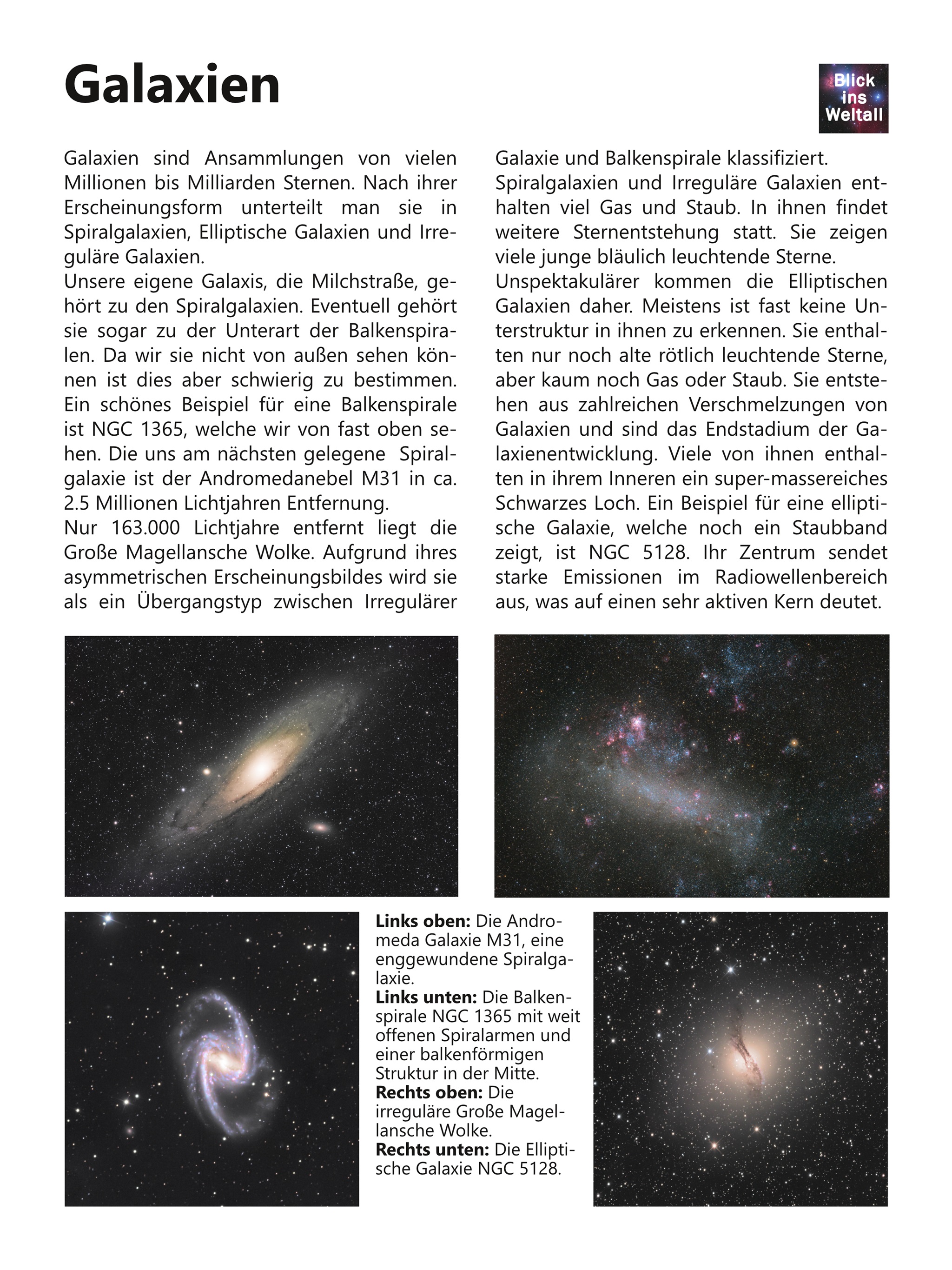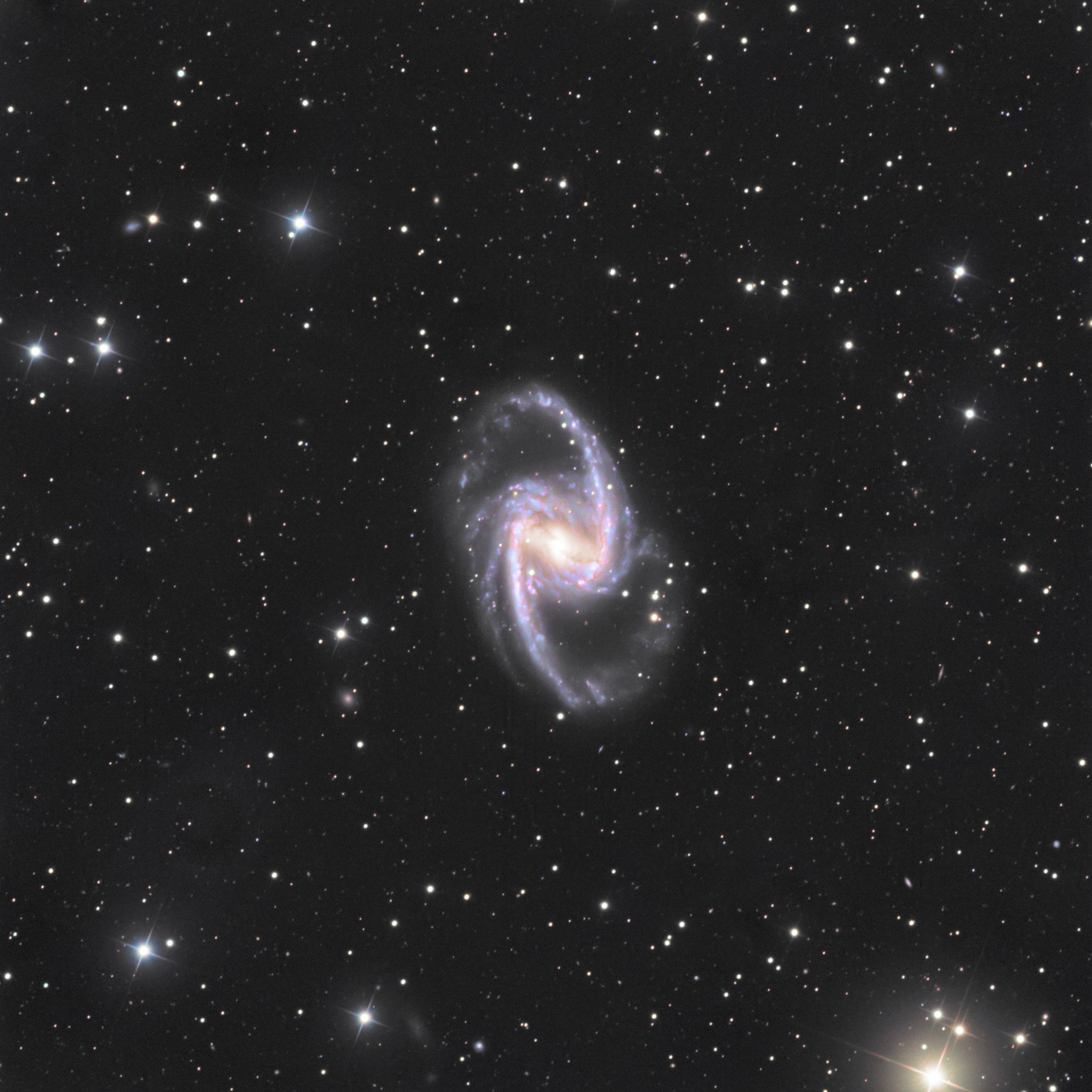NGC 1365 ist ein schöner Vertreter der Balkenspiralgalaxien. Sie ist etwa 68 Millionen Lichtjahre entfernt und gehört zum Fornax-Galaxienhaufen. Sie zeigt sehr aktive Sternentstehung in ihren Spiralarmen.