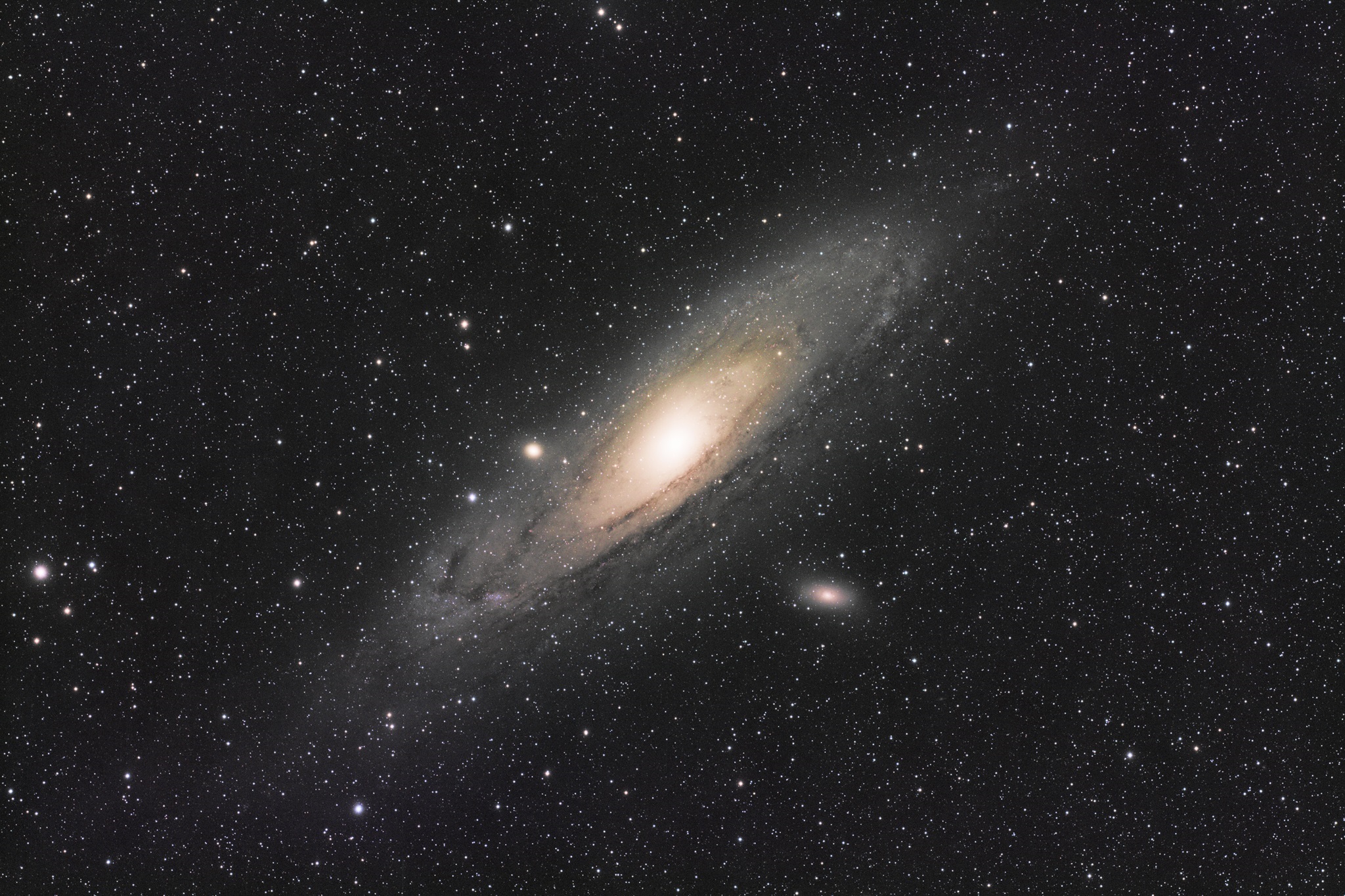 Die Spiralgalaxie M31 gehört zu unserer lokalen Galaxiengruppe und ist 2,5 Millionen Lichtjahre entfernt. In einigen Milliarden Jahren werden sie und unsere Milchstraße sich durchdringen und vermutlich zu einer Galaxie verschmelzen.