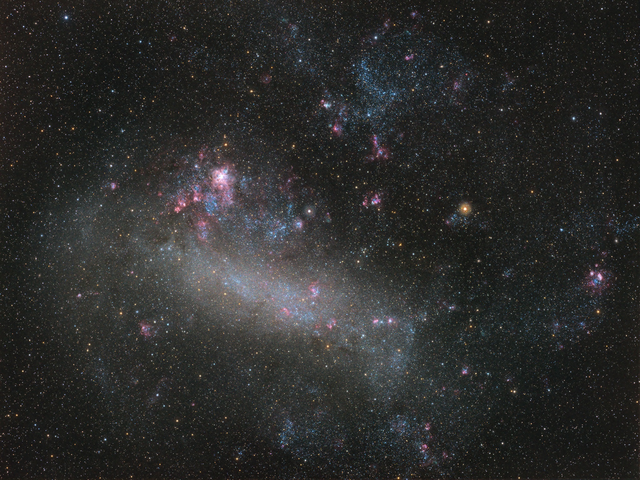 Die Große Magellansche Wolke ist eine Satellitengalaxie unserer Milchstraße in 163.000 Lichtjahren Entfernung. Sie wird als Übergangstyp zwischen Balken-Spiralgalaxie und irregulärer Galaxie klassifiziert.