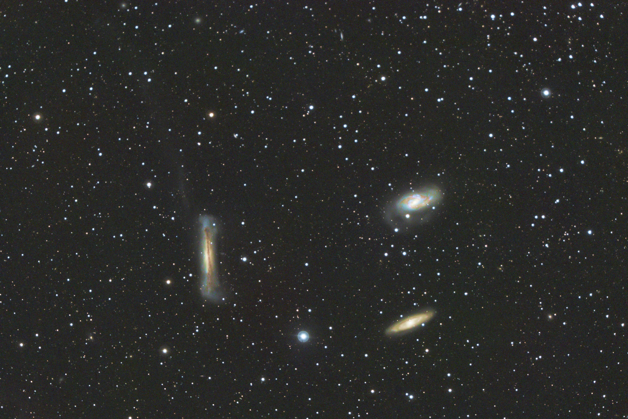 Diese Gruppe von Galaxien im Sternbild Löwe bezeichnet man als das Leo-Triplett. Die Galaxien stehen auch räumlich nahe zusammen und sind Teil der M66-Galaxiengruppe in etwa 32 Millionen Lichtjahren Entfernung.