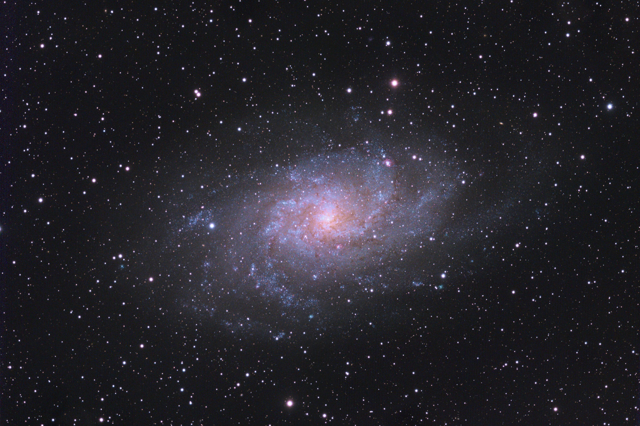 Die Spiralgalaxie Messier 33 im Sternbild Dreieck gehört zur sogenannten Lokalen Gruppe der auch unsere Milchstraße angehört. Sie ist etwa 2,7 Millionen Lichtjahre entfernt und bewegt sich mit 180 km/s auf uns zu.